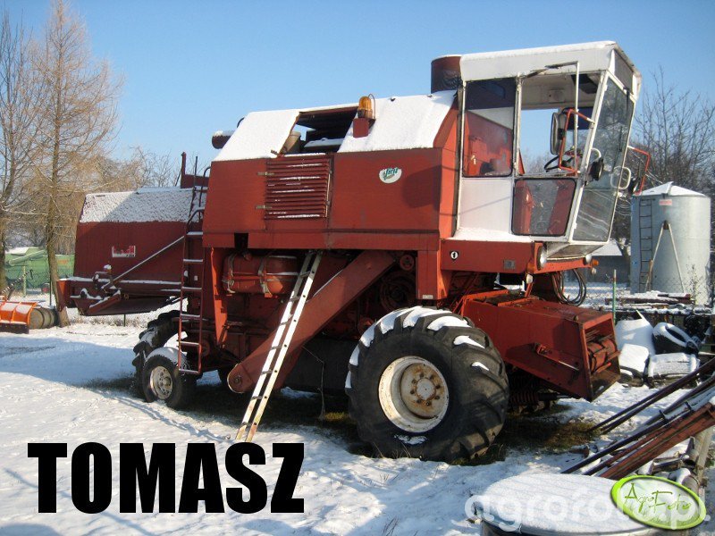 Kombajn Bizon Rekord Z058 widoczny na zdjęciu stoi na placu gospodarstwa, otoczony jest zimowym krajobrazem, co sugeruje przerwę w pracach polowych. Maszyna ta charakteryzuje się charakterystyczną czerwono-białą kolorystyką i masywną konstrukcją. Bizon Rekord Z058 jest wyposażony w silnik o mocy około 150 KM, co pozwala na efektywne zasilanie systemu omłotu typu wytrząsaczowego. Posiada heder z motowidłami, co świadczy o jego przeznaczeniu do koszenia zbóż. Zbiornik ziarna o pojemności 3000 litrów umożliwia pracę na dużych obszarach bez częstego przerywania na rozładunek. Konstrukcja kabiny zapewnia operatorowi dobrą widoczność i komfort pracy. Choć obecnie w stanie spoczynku, maszyna ta jest gotowa do ponownego podjęcia pracy, gdy tylko warunki pogodowe na to pozwolą.