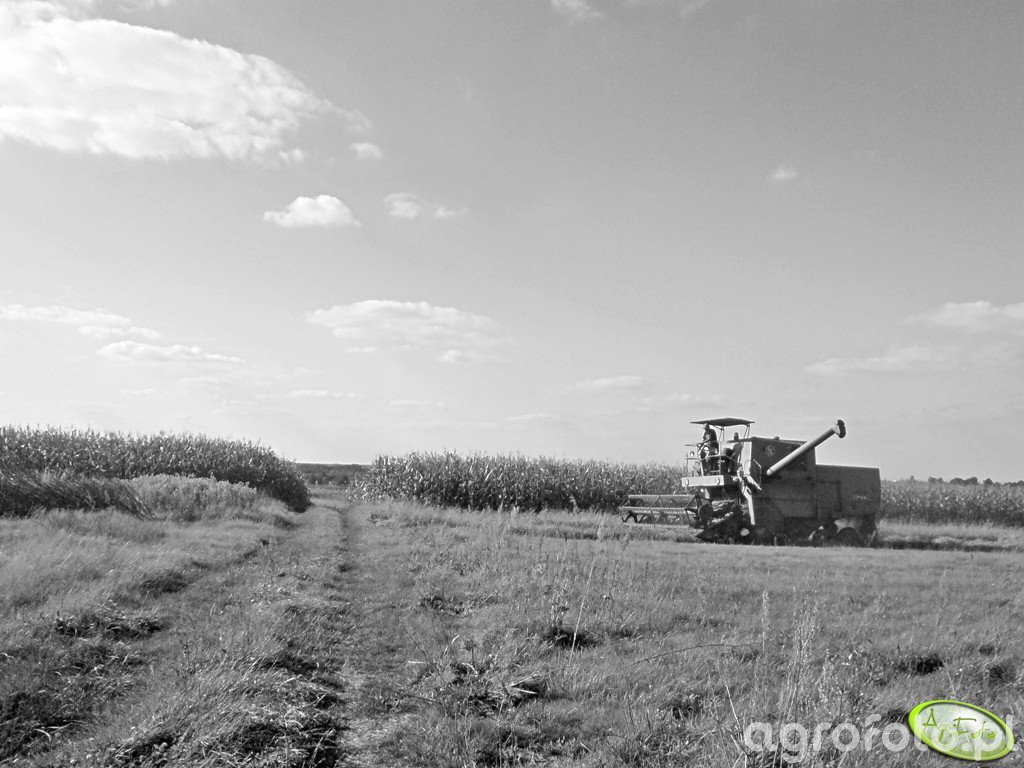 Kombajn Bizon Z056 podczas prac na polu usianym kukurydzą. Maszyna wyposażona jest w klasyczny silnik sześciocylindrowy o mocy około 100 KM, co zapewnia wystarczającą siłę napędową do zbiorów. Zbiornik ziarna o pojemności 3000 litrów umożliwia efektywną pracę bez częstego przerywania na rozładunek. Heder z motowidłami pozwala na sprawne koszenie zboża, co czyni go wszechstronną maszyną na różne typy żniw. Otoczenie wskazuje na prace odbywające się przy dobrej pogodzie na polu, gdzie kombajnista operuje maszyną w gęstym łanie kukurydzy, przygotowując się do kolejnych etapów zbioru.
