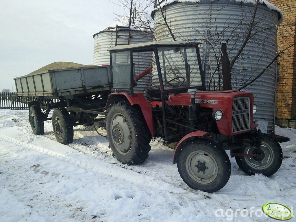 Ursus C-330 w kategorii lekkich ciągników użytkowych pracuje tutaj w transporcie z jednoosiową przyczepą rolniczą, przewożąc płody z pola. Dwucylindrowy silnik wysokoprężny S-312C o pojemności 1960 cm³ rozwija 30 KM, co w połączeniu z prostą, niesynchronizowaną skrzynią biegów 6/2 zapewnia wystarczający uciąg do prac transportowych i lekkiej uprawy. Masa własna około 1900 kg oraz udźwig tylnego TUZ rzędu 800–900 kg pozwalają na agregowanie niewielkich maszyn zawieszanych, choć w tym zestawie C-330 pełni głównie funkcję ciągnika do zwozu. Model produkowano w latach 1967–1987 w Zakładach Mechanicznych Ursus, a dziś na rynku wtórnym w Polsce jego przybliżone ceny wahają się zazwyczaj w granicach 15–30 tys. zł w zależności od stanu technicznego i wyposażenia.