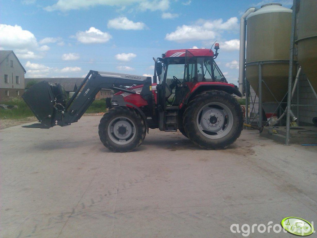 **McCormick Mc115 – Niezawodny towarzysz w gospodarstwie** McCormick Mc115 to solidny koń pociągowy, który zyskał uznanie w polskich gospodarstwach. Prezentowany egzemplarz, najprawdopodobniej z rocznika 2002-2008, dumnie prezentuje się na placu, wyposażony w potężny ładowacz czołowy Quickie Q56 z widłami – prawdziwa prawa ręka przy każdej robocie w obejściu, od załadunku obornika po obsługę big-bagów czy podawanie paszy do tych silosów w tle. Pod jego czerwoną maską bije pancerne serce – czterocylindrowy silnik Perkins o pojemności 4.4 litra i mocy około 110-115 KM, który mimo upływu lat wciąż niezawodnie ciągnie i zasila. Stan maszyny na zdjęciu, z solidnymi oponami i czystą blacharką, świadczy o tym, że właściciel dba o swój sprzęt, co tylko potwierdza szacunek dla tego modelu. Mc115 to maszyna, która wciąż trzyma cenę na rynku wtórnym; dziś za taki zadbany egzemplarz z turem trzeba zapłacić w Polsce od 75 do 105 tys. zł, co najlepiej świadczy o jego niezawodności i popularności wśród rolników. To maszyna, która nie boi się ciężkiej pracy i ma przed sobą jeszcze wiele lat wydajnej służby.
