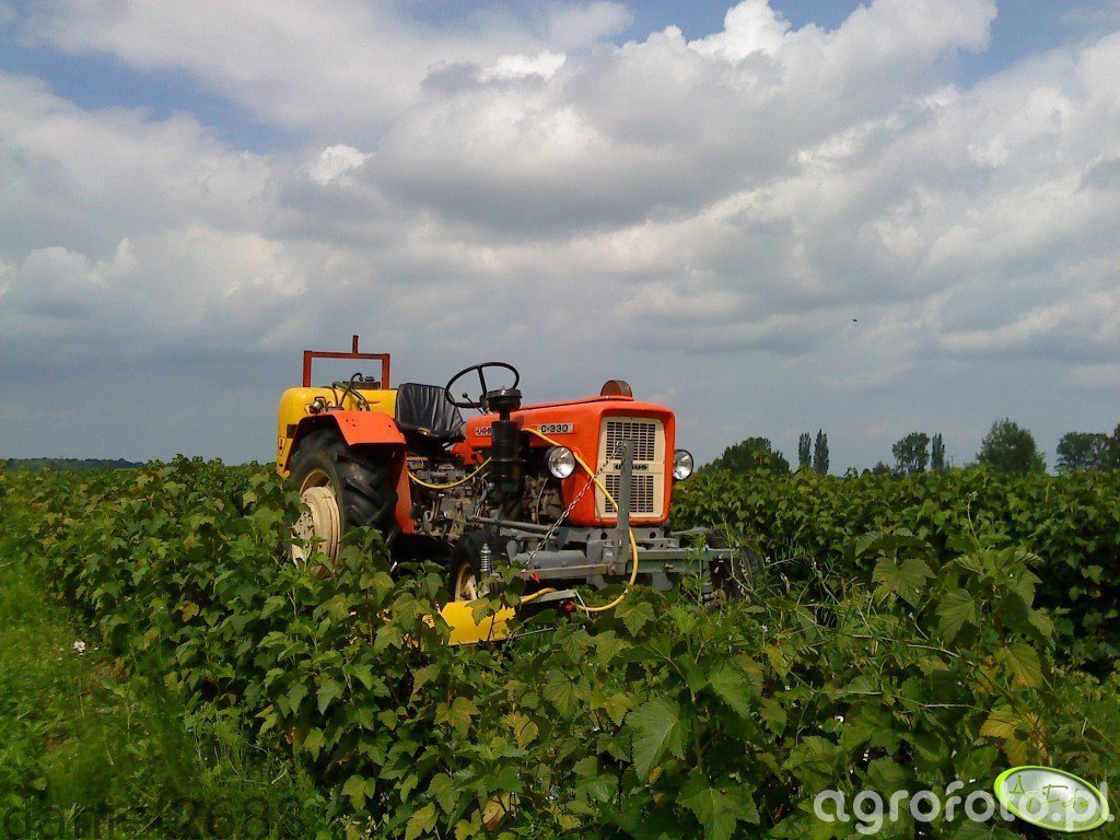 Ursus C-330 współpracuje z przyczepianym opryskiwaczem polowym podczas zabiegu ochrony roślin w sadzie, wykorzystując swoją niewielką masę i zwrotność charakterystyczną dla tego modelu. Ciągnik napędzany jest dwucylindrowym silnikiem wysokoprężnym S-312C produkcji Ursus o pojemności 1960 cm³ i mocy około 30 KM, co w zupełności wystarcza do pracy z lekkimi maszynami zawieszanymi i zaczepianymi w międzyrzędziach. Mechaniczna skrzynia biegów o 6 przełożeniach do przodu i 2 wstecz pozwala dobrać odpowiednią prędkość roboczą do oprysku, a udźwig tylnego TUZ rzędu 1200 kg zapewnia stabilne przenoszenie masy opryskiwacza z pełnym zbiornikiem. Masa własna ciągnika około 1900 kg sprzyja trakcji na miękkim podłożu sadowniczym. Model C-330 produkowano w Polsce w latach 1967–1987, a przybliżone ceny rynkowe zadbanych używanych egzemplarzy mieszczą się zwykle w przedziale 20–35 tys. zł.