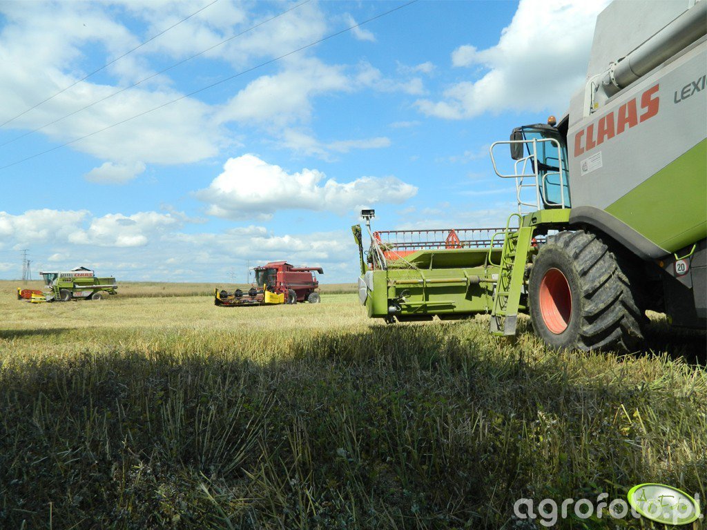 Kombajn Claas Lexion 580 podczas prac żniwnych na polu zboża. Maszyna wyposażona jest w szeroki heder z motowidłami, co umożliwia efektywne koszenie zbóż. Napędzana silnikiem Mercedes-Benz o mocy 415 KM, pozwala na profesjonalne wykonanie prac polowych dzięki systemowi omłotu APS Hybrid. Zbiornik o pojemności 11 500 litrów zapewnia długą operację bez potrzeby częstego opróżniania. Na zdjęciu widać kombajn w dynamicznym kontekście pracy na ściernisku, co podkreśla jego wydajność i niezawodność w warunkach typowych dla sezonu żniwnego.