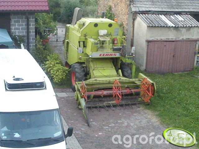 Kombajn Claas Mercator 60 widoczny na zdjęciu znajduje się na placu gospodarstwa po zakończonych pracach żniwnych. Maszyna wyposażona jest w heder z motowidłami, co wskazuje, że jest używana do koszenia zbóż. Claas Mercator 60 dysponuje silnikiem o mocy około 105 KM, który napędza klasyczny bębnowo-klawiszowy system omłotu, charakterystyczny dla tej serii. Pojemność zbiornika ziarna wynosi około 3 000 litrów, co pozwala na wydajną pracę w średnich gospodarstwach rolniczych. Na zdjęciu widać charakterystyczną, zieloną konstrukcję kombajnu i szerokie koła przystosowane do jazdy po różnorodnym terenie. Kombajn jest zaparkowany w pobliżu zabudowań gospodarczych, co podkreśla jego uniwersalność i praktyczność w rolnictwie.