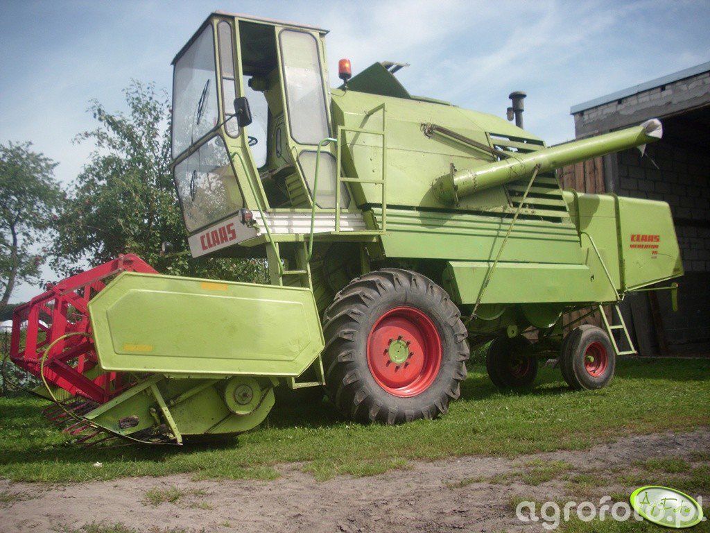 Kombajn Claas Mercator 70 przedstawiony na zdjęciu to maszyna doskonale znana z wydajności w średniej wielkości gospodarstwach rolnych. Kombajn wyposażony jest w heder z motowidłami, co wskazuje na jego przeznaczenie do koszenia zbóż. Zastosowany w nim silnik Mercedes-Benz OM 314 generuje moc około 87 KM, co w połączeniu z bębnowym systemem omłotu zapewnia skuteczne przetwarzanie zebranych zbóż. Pojemność zbiornika wynosząca około 3 000 litrów pozwala na efektywną pracę w polu bez częstego przerywania jej w celu wyładunku ziarna. Widoczna na zdjęciu kabina operatora zapewnia dobrą widoczność oraz komfort pracy, co jest istotne podczas długotrwałych operacji żniwnych. Maszyna jest zaparkowana na terenie gospodarstwa, gotowa na sezonowe prace w polu.