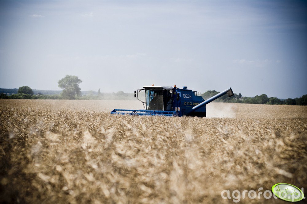 Kombajn Bizon Z110 podczas prac żniwnych na polu zboża. Maszyna ta charakteryzuje się wyraźnym niebieskim kolorem i napisem „Bizon” widocznym na kabinie. Kombajn wyposażony jest w heder z motowidłami, przeznaczony do koszenia zbóż, co precyzyjnie odzwierciedla jego pracę na polu. Model Z110 wykorzystuje silnik o mocy około 220 KM, który zapewnia wystarczającą moc do efektywnego napędu mechanizmów w wymagających warunkach polowych. Posiada zbiornik ziarna o pojemności sięgającej 4500 litrów, co pozwala na długotrwałą pracę bez konieczności częstego wyładowywania plonu. W połączeniu z szerokością roboczą hedera, kombajn ten oferuje dużą wydajność w zbiorach, co jest kluczowe podczas intensywnego sezonu żniwnego. Obraz przedstawia maszynę w trakcie pracy na rozległym polu zbożowym, otoczoną pyłem unoszącej się słomy, co dodatkowo podkreśla dynamiczny charakter żniw.
