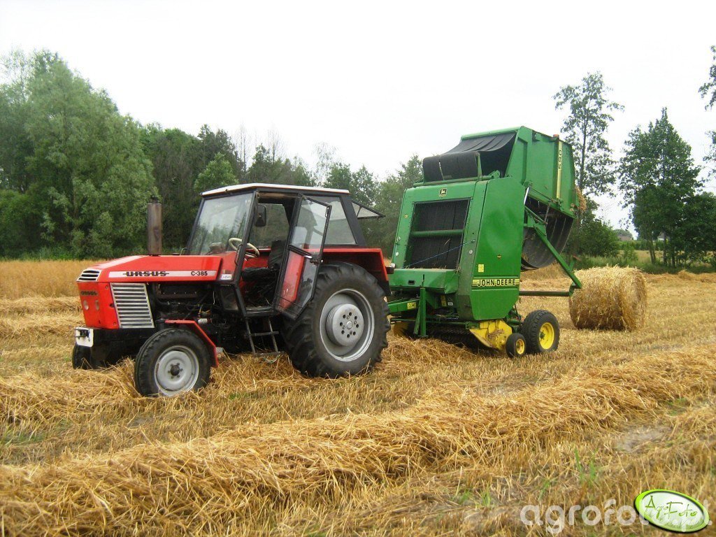 Ursus C-385 współpracuje z prasą rolującą John Deere 590 przy prasowaniu słomy żytniej bezpośrednio po żniwach, wykorzystując moc około 80 KM z czterocylindrowego silnika wysokoprężnego Zetor/Zetor-Ursus o pojemności 4,6 l. Maszyna, produkowana w latach 1971–1984, wyposażona jest w mechaniczną skrzynię biegów 4 2 z reduktorem (łącznie 16/8 przełożeń), co umożliwia dobranie odpowiedniej prędkości roboczej do gęstości pokosu i wydajności prasy John Deere 590. Masa własna rzędu 3,8 t zapewnia odpowiednią trakcję i stabilność zestawu, a tylny TUZ o udźwigu około 3,5 t pozwala bezproblemowo obsługiwać zawieszone maszyny towarzyszące, choć w tym przypadku prasa jest zaczepiana na dolny zaczep. Ursus C-385 pozostaje popularnym ciągnikiem na polskich gospodarstwach, a przybliżone ceny używanych egzemplarzy wahają się zwykle w granicach 35–55 tys. zł w zależności od stanu i wyposażenia.
