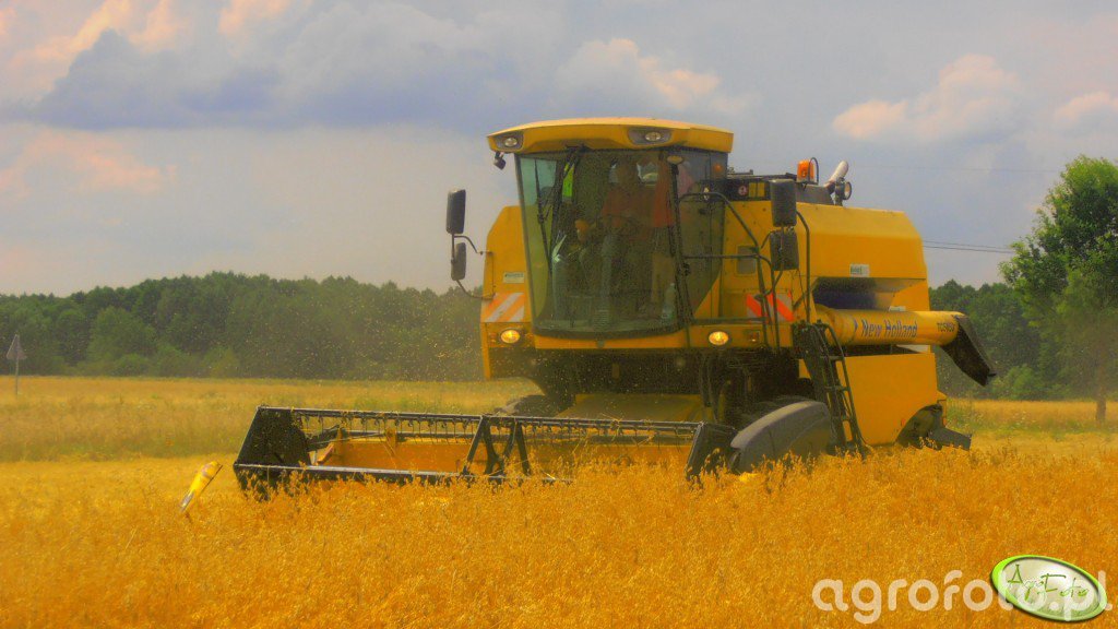 Kombajn New Holland TC5050 podczas koszenia zboża. Maszyna widoczna na obrazie jest wyposażona w heder z motowidłami, co wskazuje na jej zastosowanie w pracach żniwnych. Kombajn New Holland TC5050 napędzany jest czterocylindrowym silnikiem o mocy 175 KM, co pozwala na efektywne prowadzenie procesu omłotu przy użyciu konwencjonalnego systemu bębnowego. Zbiornik ziarna o pojemności 5200 litrów umożliwia wydłużoną pracę bez częstego rozładunku. Zdjęcie prezentuje kombajn w kontekście pracy na polu zboża, w otoczeniu typowej wiejskiej scenerii, co podkreśla profesjonalne wykorzystanie maszyny w czasie żniw.