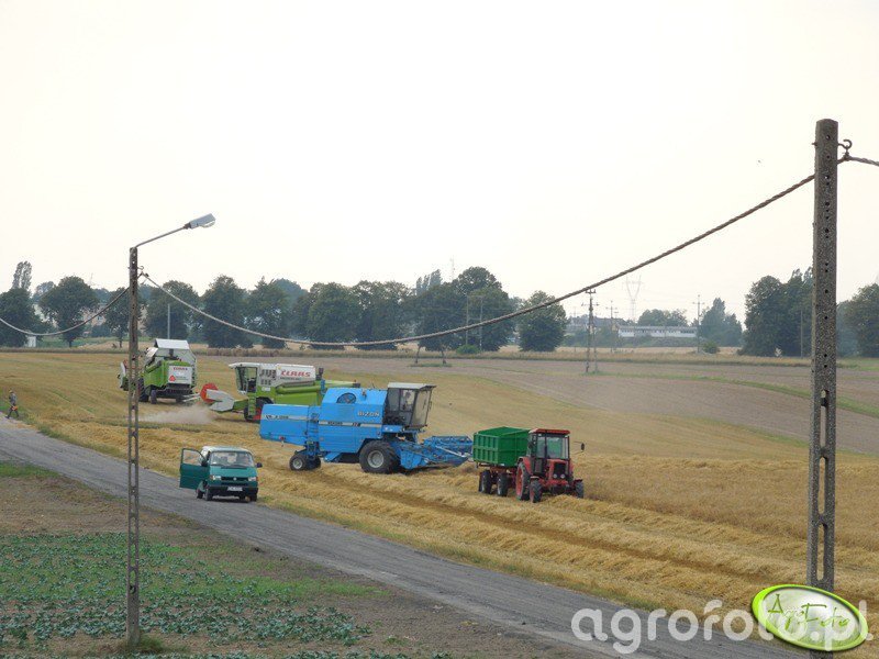 Kombajn Bizon Rekord Z058 podczas prac żniwnych na polu zboża. Maszyna jest napędzana silnikiem o mocy 150 KM, co pozwala efektywnie wykonywać zadania związane z omłotem zboża. Wyposażony w heder o szerokości 5,1 m z motowidłami, kombajn sprawnie kosi zboże, a jego zbiornik o pojemności 3000 litrów umożliwia długotrwałą pracę bez częstych przerw na rozładunek. W towarzystwie systemu przenośników ślimakowych, Bizon Rekord Z058 doskonale radzi sobie na dużych polach uprawnych. Otoczenie obejmuje przestrzeń rolniczą pełną dojrzałego zboża, przygotowanego do zbioru.