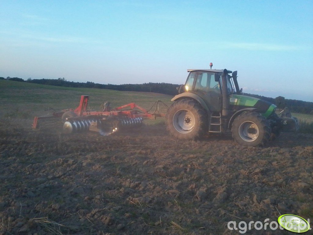 Ciągnik Deutz-Fahr Agrotron M620 pracuje na polu współpracując z broną talerzową Akpil. Wyposażony w silnik o mocy znamionowej 165 KM, doskonale radzi sobie z intensywnymi zadaniami, zapewniając efektywną uprawę gleby. Silnik o pojemności 6.1 litra gwarantuje optymalną wydajność, a 6-cylindrowa konstrukcja dostarcza odpowiednią moc do ciężkich prac polowych. Mechaniczna skrzynia biegów 24/24 umożliwia precyzyjną kontrolę podczas talerzowania, co zwiększa efektywność operacyjną. Zastosowanie nowoczesnej technologii w konstrukcji Agrotron M620 oraz jego współpraca z narzędziami Akpil zapewniają wysoką jakość upraw i znacząco zwiększają produktywność gospodarstwa.