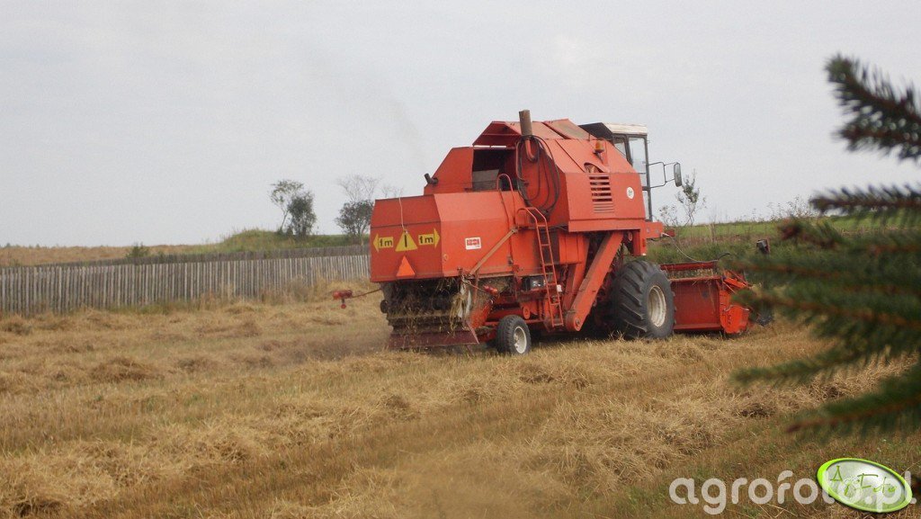 Kombajn Bizon Rekord Z058 podczas żniw na polu zboża. Ta charakterystyczna maszyna, znana z czerwono-pomarańczowej kolorystyki, jest wyposażona w silnik o mocy 165 KM oraz pojemność zbiornika na ziarno wynoszącą 3 000 litrów. Kombajn wykorzystuje heder z motowidłami, co czyni go idealnym do koszenia zbóż. Dzięki efektywnemu systemowi omłotu bębnowego, Bizon Rekord Z058 zapewnia wysoką jakość pracy na polach o dużej powierzchni. Widoczne na zdjęciu pole w pełni oddaje scenerię typową dla okresu żniwnego, z charakterystycznym wzorem pokosów pozostawionych przez kombajn.
