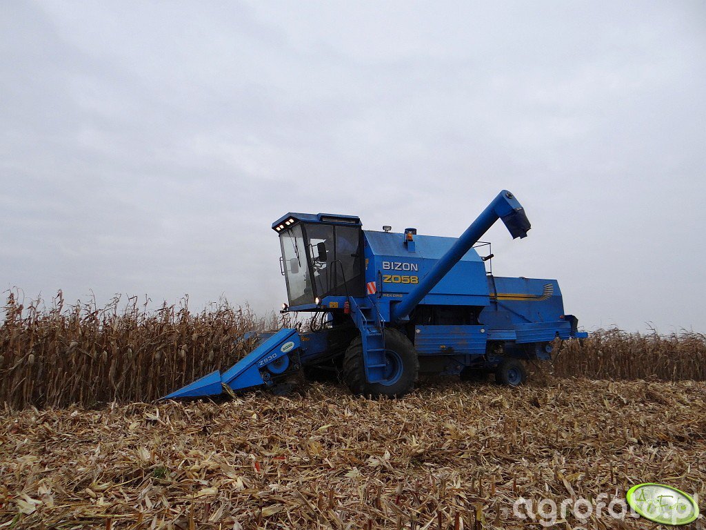 Kombajn Bizon Rekord Z058 podczas zbioru kukurydzy na polu. Maszyna jest wyposażona w specjalistyczny heder do kolb, co widać na podstawie charakterystycznych dziobów przystosowanych do pracy z kukurydzą. Bizon Z058 napędzany jest silnikiem o mocy 150 KM, co zapewnia wydajną eksploatację w trudnych warunkach polowych. Pojemność zbiornika na ziarno wynosi 3 500 litrów, co pozwala na dłuższe okresy pracy bez potrzeby częstego wyładunku. Mechaniczne połączenie systemu młócenia, opartego na klasycznych bębnach o szerokości 1 200 mm, z efektywnym systemem transportowym, podkreśla funkcjonalność i wszechstronność tej maszyny. Kombajn, utrzymany w charakterystycznej niebieskiej kolorystyce, pracuje na polu ścierniskowym, gdzie usuwane są resztki pożniwne, co podkreśla jego gotowość do wydajnego działania w zmiennych warunkach pracy.