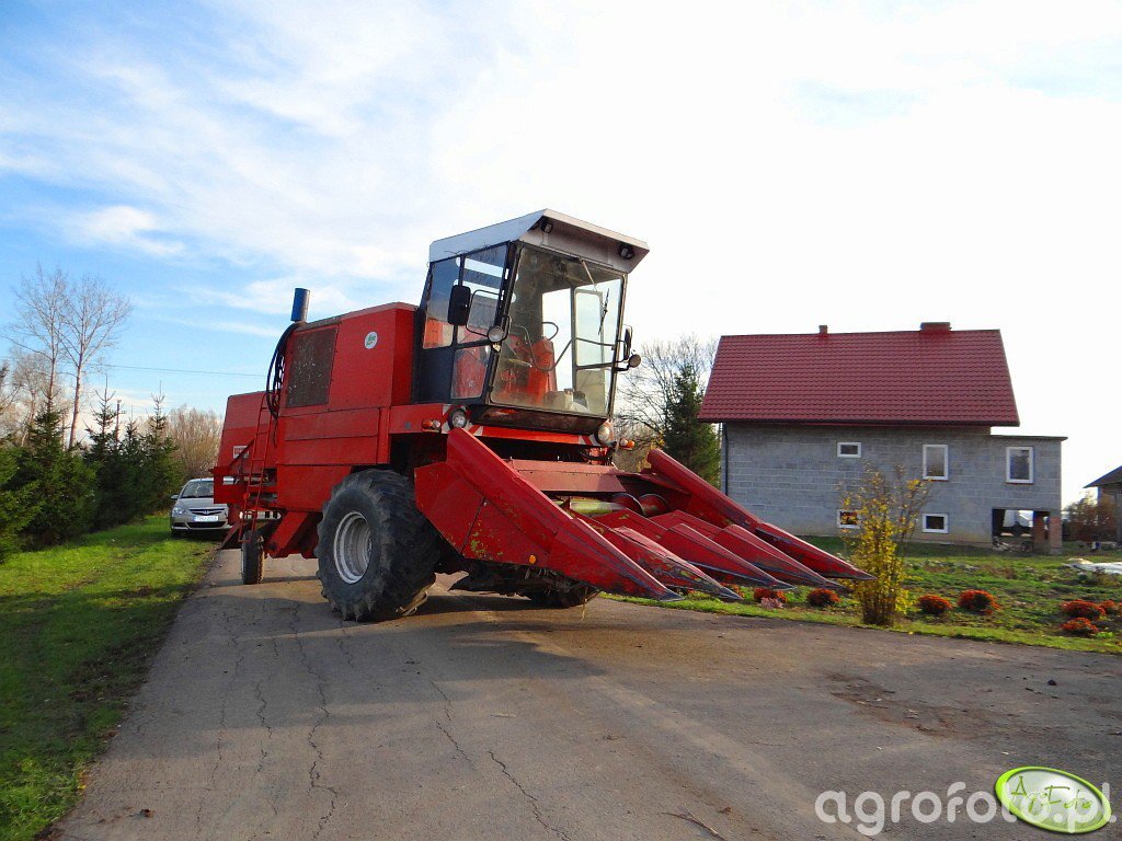 Kombajn Bizon Super Z056 z widocznym hederem wyposażonym w dzióby podczas transportu po drodze dojazdowej w pobliżu gospodarstwa. Maszyna, która uchodzi za symbol polskiego rolnictwa, jest napędzana silnikiem SW 680 o mocy 100 KM, co pozwala jej na efektywną pracę podczas zbioru kukurydzy. Bizon Super Z056 charakteryzuje się systemem omłotu z bębnem młócącym, a pojemność zbiornika na ziarno wynosi około 2,5 tony. Czerwona konstrukcja i charakterystyczny kształt kabiny podkreślają jej pochodzenie oraz solidność wykonania. W tle widoczne są elementy zabudowy gospodarczej i roślinność, co umiejscawia maszynę w typowym dla jej zastosowania rolniczym otoczeniu.
