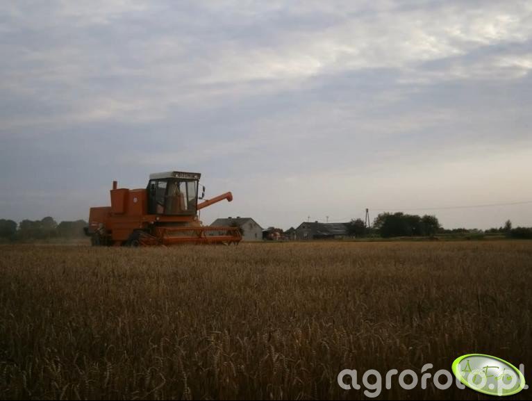 Kombajn Bizon Z056 podczas koszenia zboża na otwartym polu. Model ten, charakterystyczny dla polskiej inżynierii rolniczej, jest wyposażony w silnik SW 400 o mocy 100 KM, co pozwala na efektywne zasilanie mechanizmu omłotowego. Zbiornik ziarna o pojemności 3 000 litrów umożliwia długotrwałą pracę bez potrzeby częstego opróżniania. Heder o szerokości 4,2 metra z motowidłami idealnie nadaje się do żniw zbożowych. Rozbudowana kabina zapewnia operatorowi komfort i dobrą widoczność, co jest kluczowe podczas długich dni pracy w trakcie sezonu żniwnego. Pomarańczowa kolorystyka maszyny jest charakterystyczna dla serii Bizon, wyróżniając ją w pejzażu rolniczym.