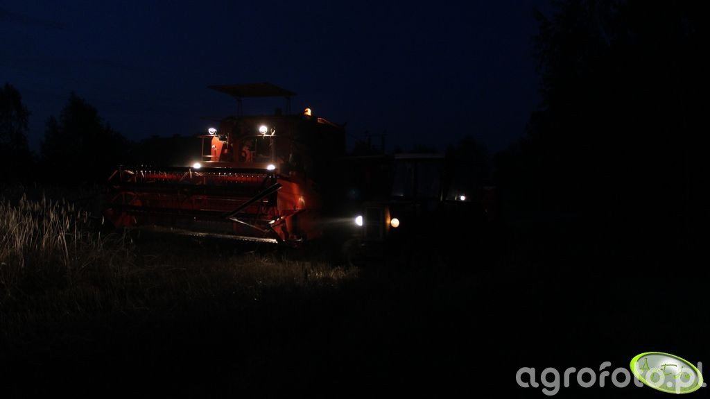 Kombajn Bizon Z056 na podwoziu Rekorda podczas nocnych prac żniwnych. Maszyna, charakterystyczna dla polskich gospodarek rolnych, jest wyposażona w heder z motowidłami, co wskazuje na koszenie zbóż. Silnik marki SW 400 generuje moc 100 KM, co zapewnia odpowiednią efektywność pracy w polu. Zbiornik na ziarno o pojemności 2100 litrów pozwala na wykonywanie dłuższych prac bez konieczności częstego opróżniania. Widoczne na fotografii oświetlenie robocze umożliwia kontynuację zbiorów po zmroku, podkreślając wszechstronność i niezawodność maszyny w różnych warunkach polowych.