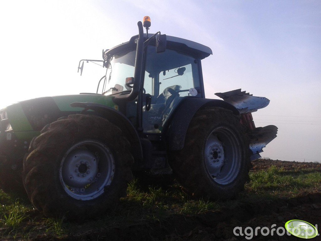 Ciągnik Deutz Fahr Agrofarm 430 Profiline pracuje na polu, współpracując z pługiem Unia Ibis L 4. Wyposażony w silnik o mocy 109 KM i 4-cylindrową konstrukcję, zapewnia efektywną pracę w zróżnicowanych warunkach terenowych. Skrzynia biegów mechaniczna 20/20 umożliwia precyzyjne dostosowanie prędkości i manewrowości podczas orki. Te zaawansowane parametry techniczne, w połączeniu z solidnym pługiem, pozwalają na głęboką i dokładną uprawę roli, zwiększając wydajność i jakość przygotowywanego gruntu pod przyszłe zasiewy.