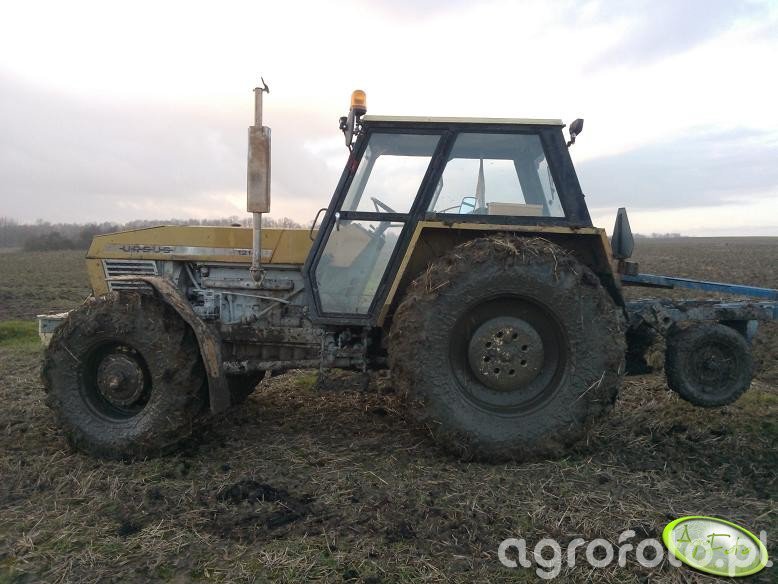 Ursus 1214 podczas orki należy do ciężkiej serii ciągników rolniczych tej marki, wyposażonych w 4‑cylindrowy silnik wysokoprężny Zetor Z 8001 o pojemności 4,6 l i mocy około 117 KM, współpracujący z mechaniczną skrzynią biegów 16/8 z reduktorem, co pozwala dobrać prędkość roboczą do głębokości i oporu gleby. Masa własna około 5,2 t poprawia trakcję z wieloskibowym pługiem zawieszanym na tylnym trzypunktowym układzie zawieszenia o udźwigu w granicach 4,2–4,5 t, dzięki czemu zestaw stabilnie utrzymuje zadaną głębokość orki nawet na cięższych glebach. Model 1214 produkowano mniej więcej od połowy lat 70. do końca lat 80., a używane egzemplarze na rynku polskim osiągają obecnie przybliżone ceny w przedziale 40–70 tys. zł w zależności od stanu technicznego, ogumienia i ewentualnych modernizacji.