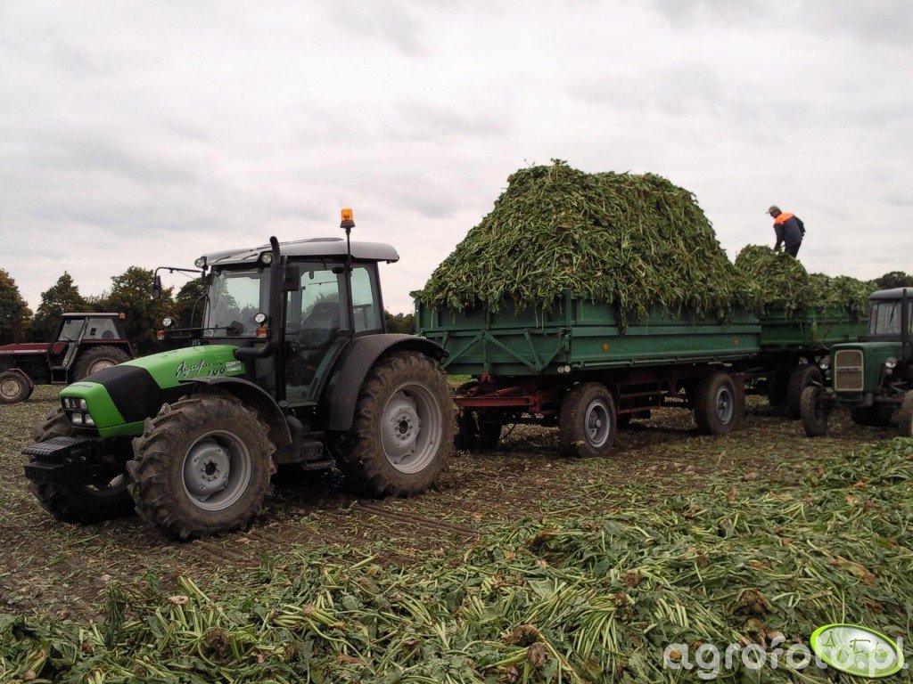 Ciągnik Deutz-Fahr Agrofarm 100 pracuje na polu podczas załadunku przyczepy rolniczej, przygotowując się do transportu zielonki. Wyposażony w silnik o pojemności 4,0 litra, potrafi wygenerować moc 102 KM, co zapewnia doskonałą wydajność przy zróżnicowanych pracach polowych. Czterocylindrowy silnik charakteryzuje się trwałością i efektywnością spalania, co jest kluczowe podczas długotrwałych zadań takich jak załadunek i przewóz. Agrofarm 100 wyróżnia się również przekładnią mechaniczną 10/10, która umożliwia precyzyjne dostosowanie prędkości jazdy do specyfiki wykonywanej czynności. Taka konfiguracja sprawia, że ciągnik jest idealnym rozwiązaniem do współpracy z różnymi maszynami towarzyszącymi, zwłaszcza podczas intensywnych sezonów zbioru zielonki.