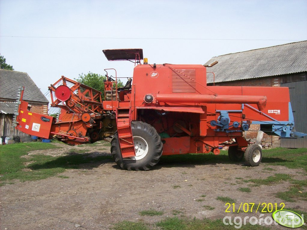 Kombajn Bizon Z056 prezentowany na zdjęciu to klasyczny model polskiej produkcji, wykorzystywany w pracach żniwnych na wielu gospodarstwach. Charakterystyczny czerwony kolor oraz oznaczenie modelu Z056 bez trudu identyfikują maszynę. Kombajn wyposażony jest w heder z motowidłami, co wskazuje na jego zastosowanie do koszenia zbóż. Urządzenie napędza sześciocylindrowy silnik o mocy około 100 KM, zapewniający wystarczającą siłę do napędzania mechanizmu młócącego bębnowego, który jest jednym z kluczowych elementów tej maszyny. Zbiornik na ziarno o pojemności około 3000 litrów umożliwia dłuższą pracę przed koniecznością rozładunku. Na zdjęciu kombajn znajduje się w otoczeniu tradycyjnych zabudowań gospodarskich, co podkreśla jego codzienną eksploatację w typowym wiejskim gospodarstwie.