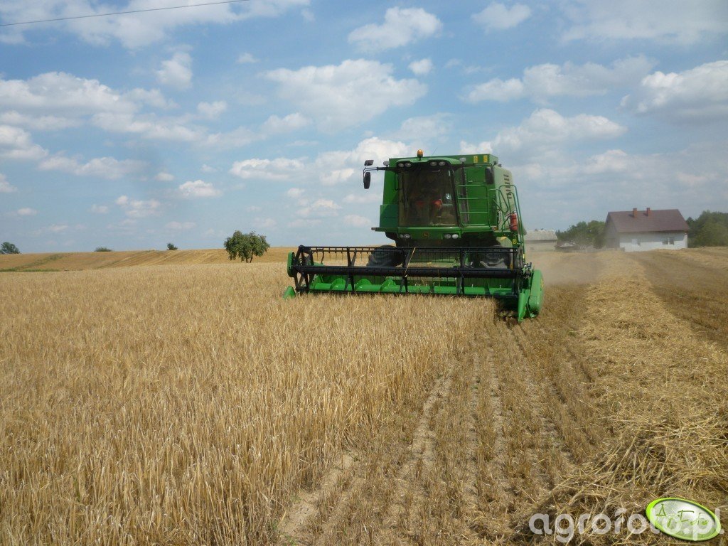 Kombajn John Deere 1470 podczas koszenia zboża. Na zdjęciu widoczny jest heder z motowidłami, co wskazuje na pracę w uprawie zbóż. Maszyna wyposażona jest w silnik o mocy około 305 KM, co zapewnia odpowiednią moc do efektywnego działania w polu. Kombajn posiada zbiornik na ziarno o pojemności 8000 litrów, a system omłotu oparty jest na technologii tangencjalnej, co gwarantuje skuteczne oddzielanie ziarna od reszty rośliny. Zdjęcie ukazuje kombajn podczas pracy na polu, z rozległym obszarem ścierniska w tle, co podkreśla jego wydajność i zdolność do przetwarzania dużych ilości materiału w krótkim czasie.