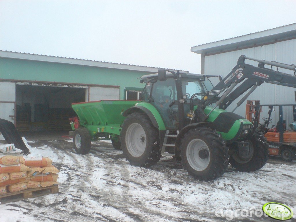 Ciągnik Deutz-Fahr z serii RCW pracuje na placu gospodarstwa, przygotowując się do nawożenia. Skonstruowany z myślą o wydajności, posiada silnik o mocy 150 KM, co umożliwia efektywną współpracę z ciężkim rozsiewaczem nawozów. Silnik Deutz charakteryzuje się wysoką trwałością i niezawodnością, wspierany przez sześciocylindrową pojemność skokową 6.1 L, co zapewnia odpowiednią moc w każdych warunkach pracy. Ciągnik jest wyposażony w mechaniczną skrzynię biegów o 12 przełożeniach, co pozwala na precyzyjne dostosowanie prędkości do wykonywanych zadań. Ładowacz czołowy wspomaga również obsługę materiałów sypkich, co czyni z niego wszechstronne narzędzie w codziennych pracach gospodarskich.