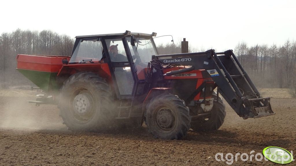 Ursus 914 z ładowaczem czołowym Quicke 670 pracuje przy nawożeniu pola z użyciem zawieszanego rozsiewacza nawozów, wykorzystując solidną konstrukcję tej serii ciągników średniej mocy. Model 914, produkowany w Polsce w latach około 1984–1992, wyposażony jest w 4‑cylindrowy silnik wysokoprężny Zetor/ZTS o pojemności 4,6 l i mocy około 82 KM, co zapewnia wystarczający zapas momentu do pracy z ładowaczem oraz maszynami zawieszanymi. Mechaniczna skrzynia biegów z 16/8 przełożeniami ułatwia dobór prędkości roboczej podczas równomiernego wysiewu nawozu, a tylny TUZ o udźwigu około 3,5 t stabilnie przenosi ciężar rozsiewacza z pełnym zasypem. Masa własna ciągnika sięgająca 4,2–4,5 t poprawia trakcję na polu, co ogranicza poślizg na miękkiej glebie. Używane Ursusy 914 na rynku polskim osiągają obecnie przybliżone ceny w zakresie 45–75 tys. zł w zależności od stanu, wyposażenia i roku produkcji.