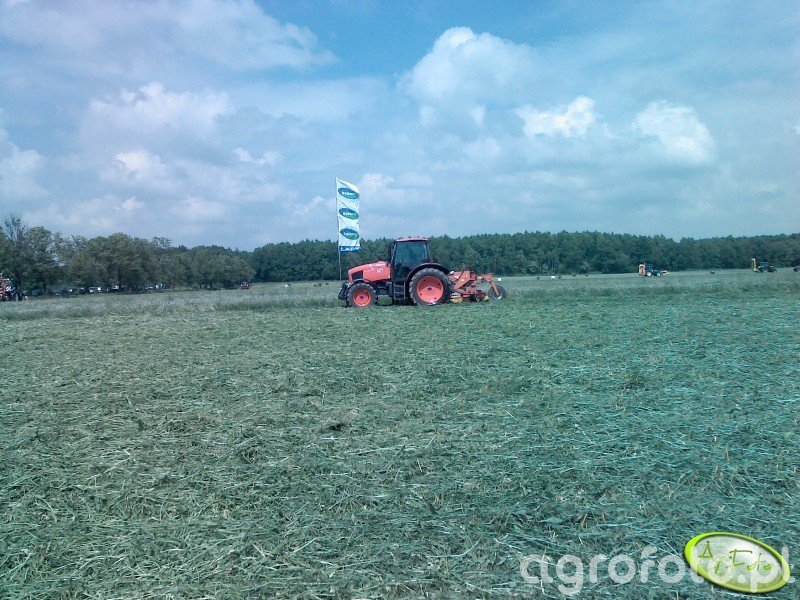 Na zdjęciu przedstawiono ciągnik rolniczy Kubota M135GX, popularny model w serii MGX, zaprojektowany do wszechstronnych prac polowych. Wyposażony w silnik o mocy 135 KM, bazuje na 4-cylindrowej jednostce napędowej, co pozwala na efektywne wykonywanie zadań, takich jak koszenie traw na dużych powierzchniach. Ciągnik Kubota M135GX charakteryzuje się mechaniczną skrzynią biegów z 24 przełożeniami, co zapewnia operatorowi precyzyjną kontrolę i płynność pracy w zmiennych warunkach terenowych. W tym ujęciu maszyna pracuje na łące, wykorzystując swoją moc do napędu urządzenia, które może być narzędziem do koszenia traw. Techniczne właściwości tego modelu, takie jak wydajny układ hydrauliczny, umożliwiają współpracę z różnorodnymi maszynami towarzyszącymi, podnosząc efektywność działań rolniczych na średnich i dużych gospodarstwach.