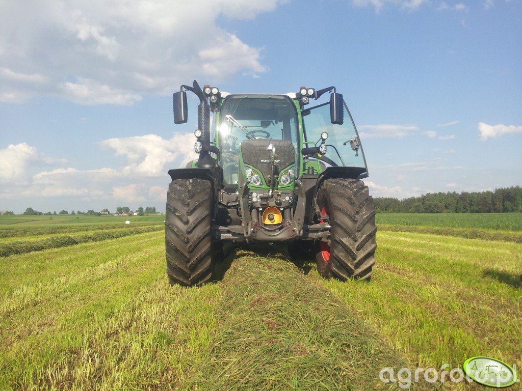 Ciągnik Fendt 714 Vario SCR, uchwycony podczas pracy na polu, charakteryzuje się połączeniem zaawansowanej technologii i wydajności. Wyposażony w silnik 6-cylindrowy o pojemności 6.06 litra oraz mocy znamionowej 150 KM, pozwala na efektywne wykonywanie różnorodnych zadań rolniczych. Bezstopniowa skrzynia biegów Vario zapewnia płynne przejścia między biegami, co znacząco ułatwia adaptację prędkości do aktualnych warunków terenowych. W kontekście tej ilustracji, Fendt 714 współpracuje z prasą kostkującą, co wymaga precyzyjnej kontroli nad mocą i trakcją, szczególnie przy zbiorach na zmiennym podłożu. Dzięki zaawansowanej hydraulice ciągnik doskonale radzi sobie z ciężkimi maszynami towarzyszącymi, co sprawia, że jest niezastąpiony w intensywnych pracach polowych.