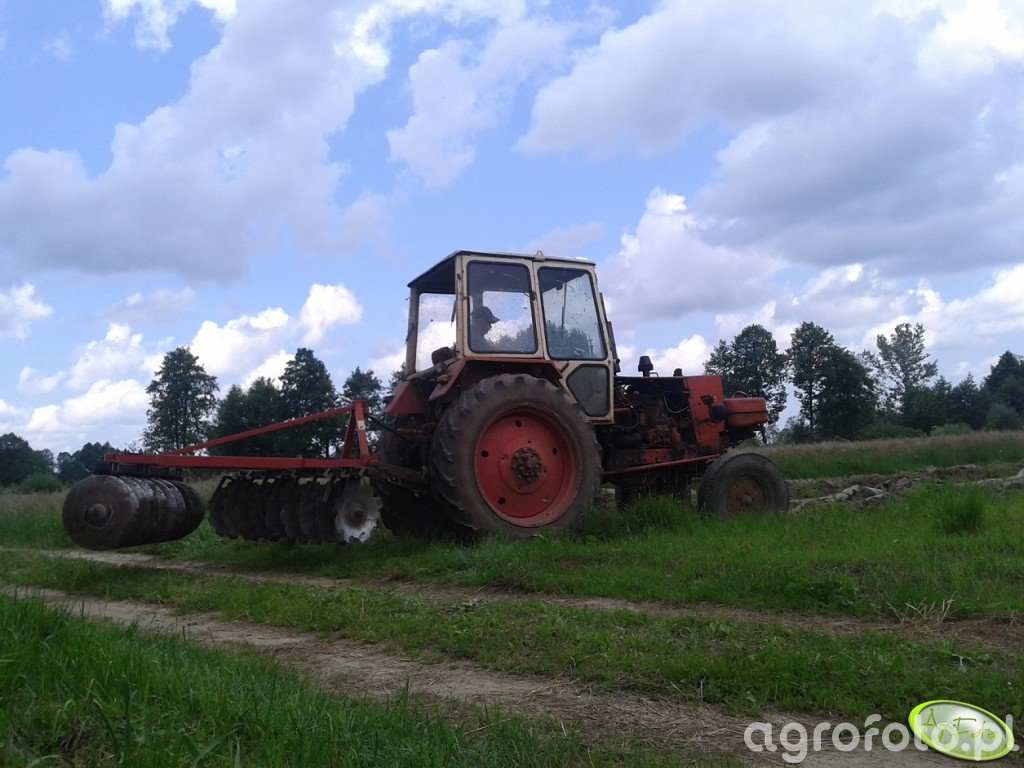 Ciągnik Jumz, znany z solidnej konstrukcji, pracuje na polu z broną talerzową Agromex. Wyposażony w silnik o pojemności 4.75 L, dysponuje mocą ok. 65 KM co pozwala na efektywne wykonywanie zadań związanych z talerzowaniem gleby. Jumz, dzięki mechanicznej skrzyni biegów 8/2, dostosowuje prędkość pracy do warunków terenowych, zapewniając wydajność podczas współpracy z talerzówką. Taka konfiguracja umożliwia obróbkę trudnych gleb poprzez intensywne mieszanie i spulchnianie, co jest niezbędne do przygotowania podłoża pod uprawy.