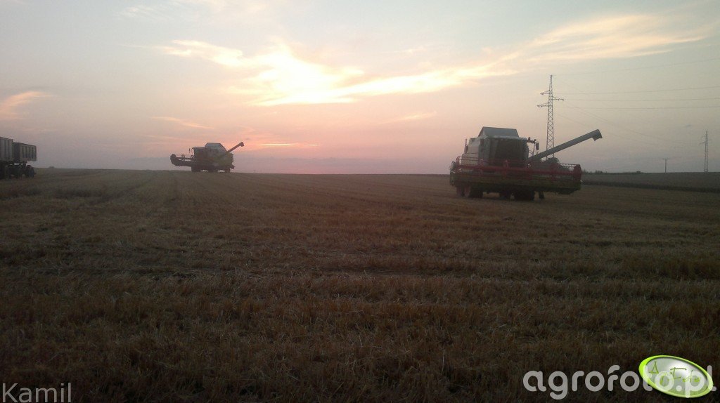 Kombajn Claas podczas prac żniwnych na polu zboża. Maszyna wyposażona w heder z motowidłami, co sugeruje koszenie zbóż. Na zdjęciu widoczne są dwa kombajny pracujące na ściernisku o zachodzie słońca. Charakterystyczne zielone i czerwone barwy Claas oraz konstrukcja kabiny wskazują na profesjonalną maszynę rolniczą. Kombajn prawdopodobnie korzysta z zaawansowanego systemu omłotu APS Hybrid, który zwiększa efektywność pracy. Wysypywanie zebranego ziarna odbywa się do przyczepy na skraju pola, co optymalizuje czas pracy i transportu plonów. Szeroki heder umożliwia szybkie działania, co jest ważne podczas intensywnych sezonów żniwnych.