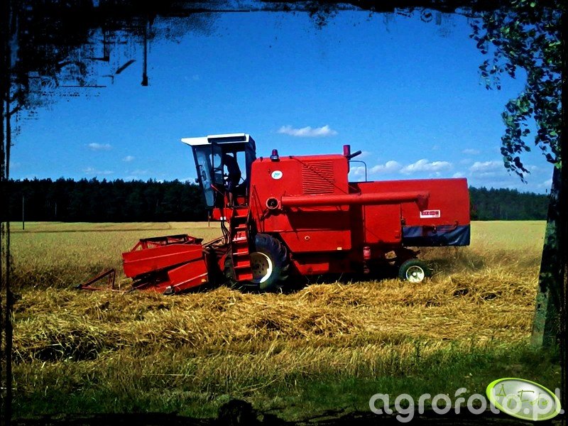 Kombajn Bizon Super Z056 podczas koszenia zboża na polu żniwnym. Maszyna wyposażona jest w heder z motowidłami, co wskazuje na zbiór zbóż takich jak pszenica czy jęczmień. Bizon Super Z056 napędzany jest silnikiem o mocy 100 KM, co pozwala na efektywne prowadzenie prac polowych. Kombajn wyposażono w bębenowy system omłotu, a pojemność zbiornika na ziarno wynosi 2500 litrów, co umożliwia dłuższą pracę bez częstego rozładunku. Charakterystyczny czerwony kolor obudowy oraz klasyczny kształt kabiny podkreślają jego tradycyjne, ale sprawdzone i solidne rozwiązania techniczne. Kombajn wykonuje swoje zadanie w pięknym wiejskim krajobrazie pod błękitnym niebem, co tworzy idylliczną scenerię pracy w polu.