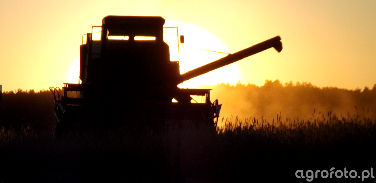 Kombajn Bizon Z056 podczas prac żniwnych na polu zboża. Ten klasyczny model z polskiej produkcji charakteryzuje się silnikiem o mocy 100 KM, co zapewnia odpowiednią wydajność w warunkach rolniczych. Z056 wykorzystuje heder z motowidłami, który jest idealny do koszenia różnych gatunków zbóż. Zbiornik ziarna o pojemności 2500 litrów umożliwia pracę bez częstych przestojów na rozładunek. Widziany na tle zachodzącego słońca, kombajn sprawia wrażenie ciężko pracującego na polu, kiedy kurz unoszący się za maszyną tworzy malowniczy efekt.