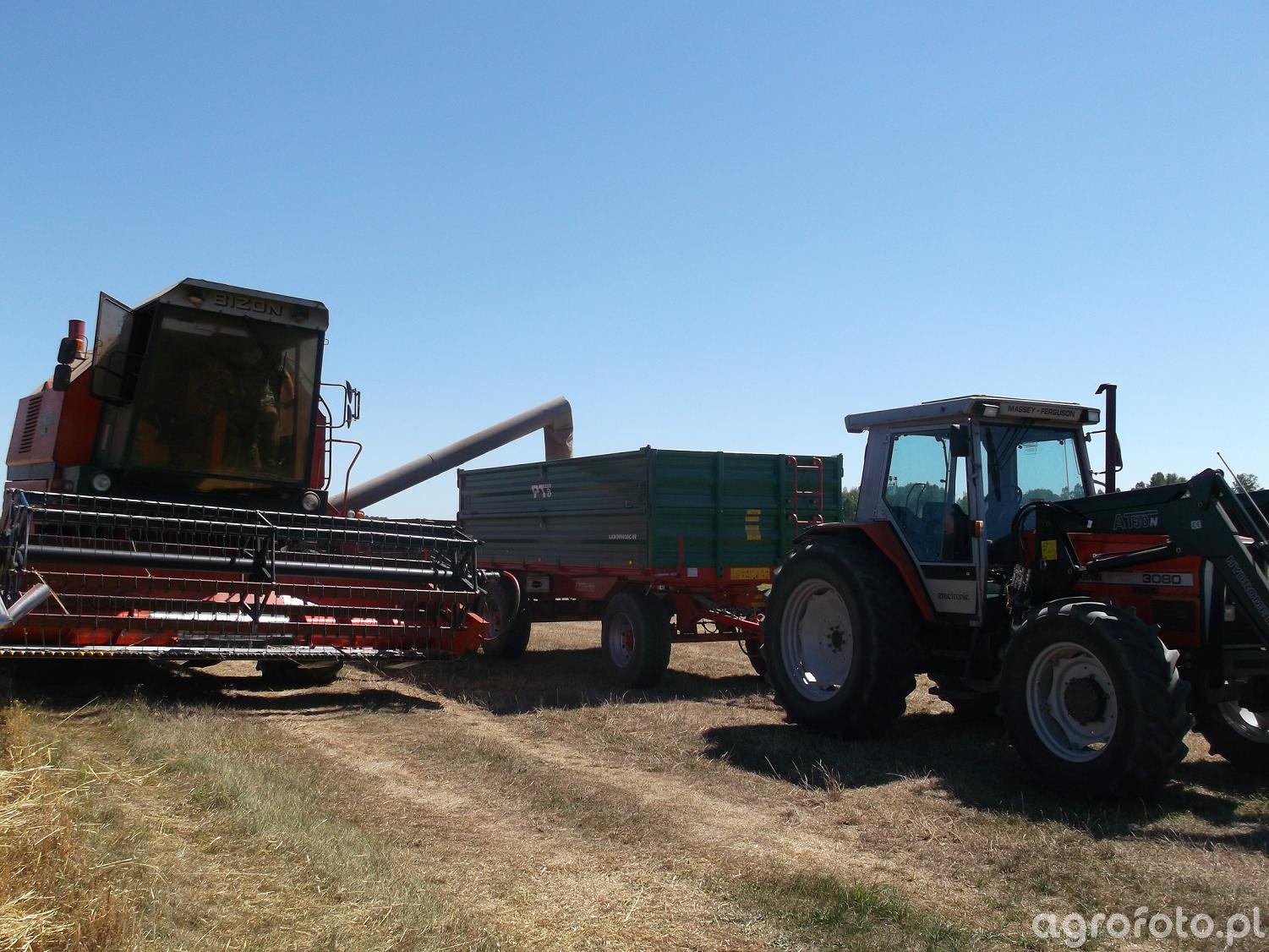 Kombajn zbożowy Bizon podczas żniw w towarzystwie ciągnika Massey Ferguson na polu uprawnym. Maszyna wyposażona jest w heder z motowidłami, co wskazuje na koszenie zbóż. Bizon, charakterystyczny dla polskich warunków rolniczych, wykorzystuje konwencjonalny system omłotu oparty na bębnie młócącym. Moc silnika takiego kombajnu może wynosić około 150-200 KM, a pojemność zbiornika ziarna oscyluje w granicach 3 500-5 000 litrów, co zapewnia wydajną pracę podczas żniw. Zdjęcie przedstawia moment, w którym ziarno jest przeładowywane do przyczepy ciągnika Massey Ferguson, gotowego do transportu plonów. Kombajn i ciągnik współpracują na ściernisku, pod błękitnym niebem, co jest typowym widokiem dla okresu żniwnego.