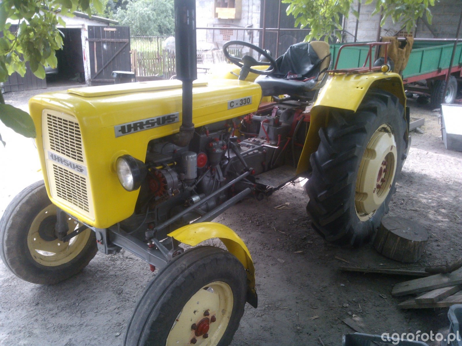 Ursus C-330 to lekki ciągnik rolniczy z serii C-3xx, wyposażony w dwucylindrowy silnik S-312C o pojemności 1960 cm³ i mocy około 30 KM, produkowany w Zakładach Mechanicznych Ursus. Konstrukcja oparta na prostej, niesynchronizowanej skrzyni biegów 6/2 dobrze współpracuje z lekkim pługiem dwuskibowym, pozwalając na płytką orkę i uprawę roli w mniejszych gospodarstwach. Masa własna ciągnika wynosi około 1600 kg, a tylny trójpunktowy układ zawieszenia (TUZ) zapewnia udźwig rzędu 800–900 kg, co wystarcza do agregowania podstawowych maszyn uprawowych i niewielkiej przyczepy rolniczej obecnej w tle placu gospodarstwa. Model C-330 był produkowany w latach 1967–1987 i do dziś pozostaje popularny na rynku wtórnym; przybliżone ceny zadbanych egzemplarzy w Polsce mieszczą się najczęściej w przedziale 15–30 tys. zł w zależności od stanu technicznego, wyposażenia i rocznika.