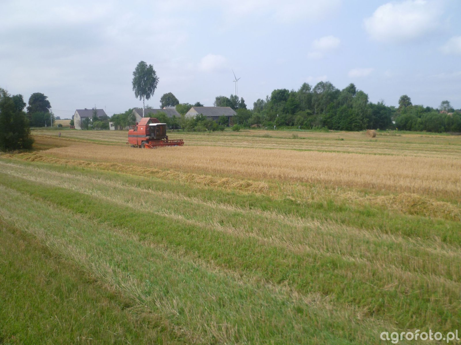 Kombajn Bizon BS-Z110 podczas koszenia zbóż na polu. Maszyna jest wyposażona w silnik o mocy około 150 KM, co zapewnia wydajność w wymagających warunkach polowych. Zastosowany system omłotu bębnowego skutecznie oddziela ziarno od plew, wspierany przez zbiornik o pojemności 3000 litrów, co umożliwia długotrwałą pracę bez przestojów. Hedera z motowidłami skutecznie zbiera zboże, a charakterystyczna czerwona kolorystyka i konstrukcja maszyny wpisują się w tradycyjny design marki Bizon, umożliwiając efektywne żniwa na różnorodnych powierzchniach rolnych.