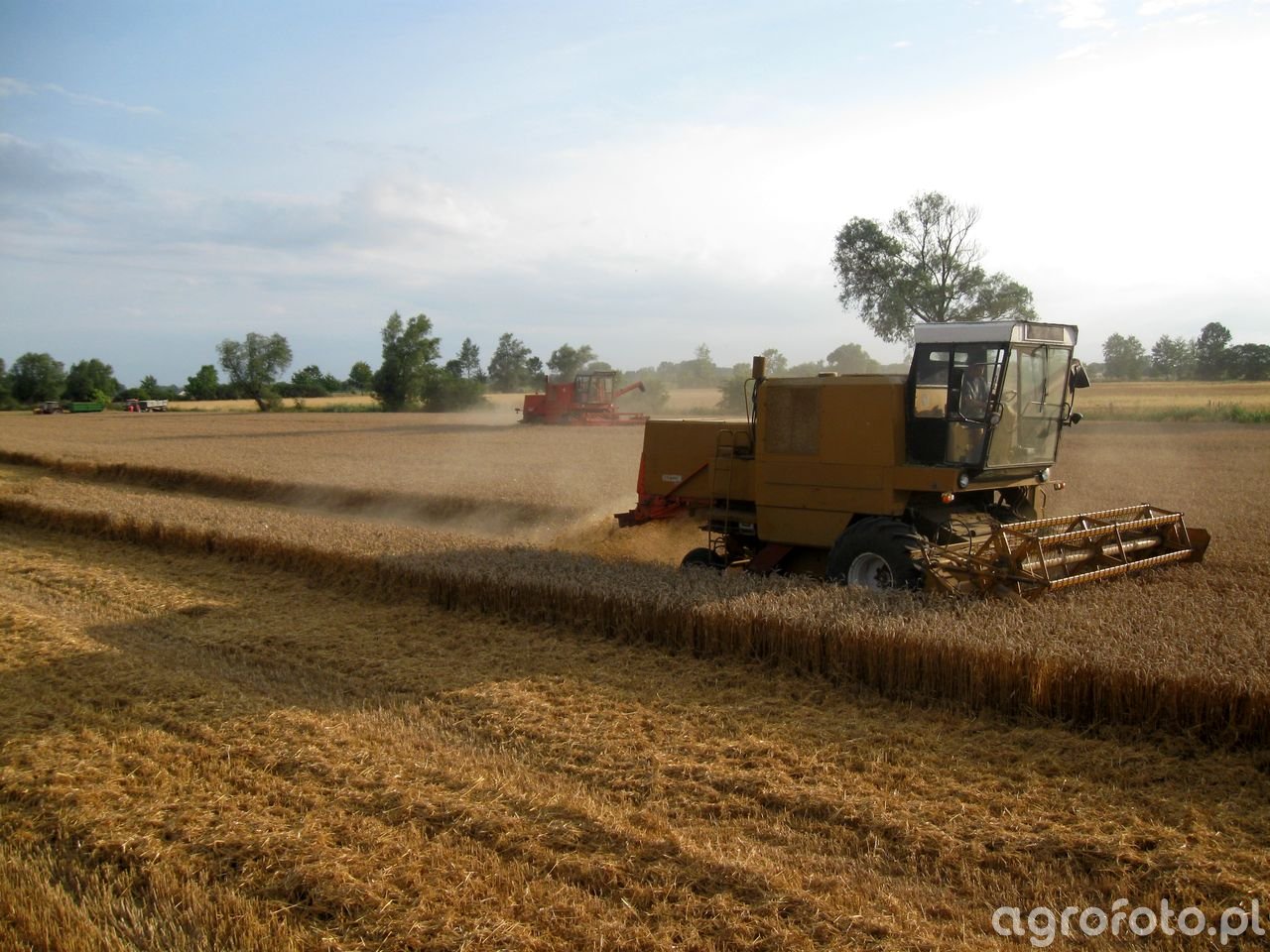Na zdjęciu widoczny jest kombajn zbożowy Bizon Super Z056 podczas pracy na polu pszenicy. Maszyna jest wyposażona w tradycyjny heder z motowidłami, co wskazuje na jej wykorzystanie do koszenia zbóż. Bizon Super Z056 zasilany jest sześciocylindrowym silnikiem SW 400 o mocy 105 KM, co zapewnia odpowiednią moc do efektywnego wykonywania pracy na dużych polach. Posiada zbiornik ziarna o pojemności 3000 litrów, umożliwiający długotrwałe operacje bez częstych przestojów na rozładunek. System omłotu oparty na klasycznej konstrukcji bębnowej gwarantuje skuteczność i precyzję w oddzielaniu ziarna od reszty rośliny. Kombajn dynamicznie porusza się po równym polu, pokazując swoją zdolność do efektywnej eksploatacji w typowych warunkach żniwnych. Otoczenie wskazuje na spokojne warunki pracy z przewiewnym niebem i rozległymi obszarami uprawnymi.
