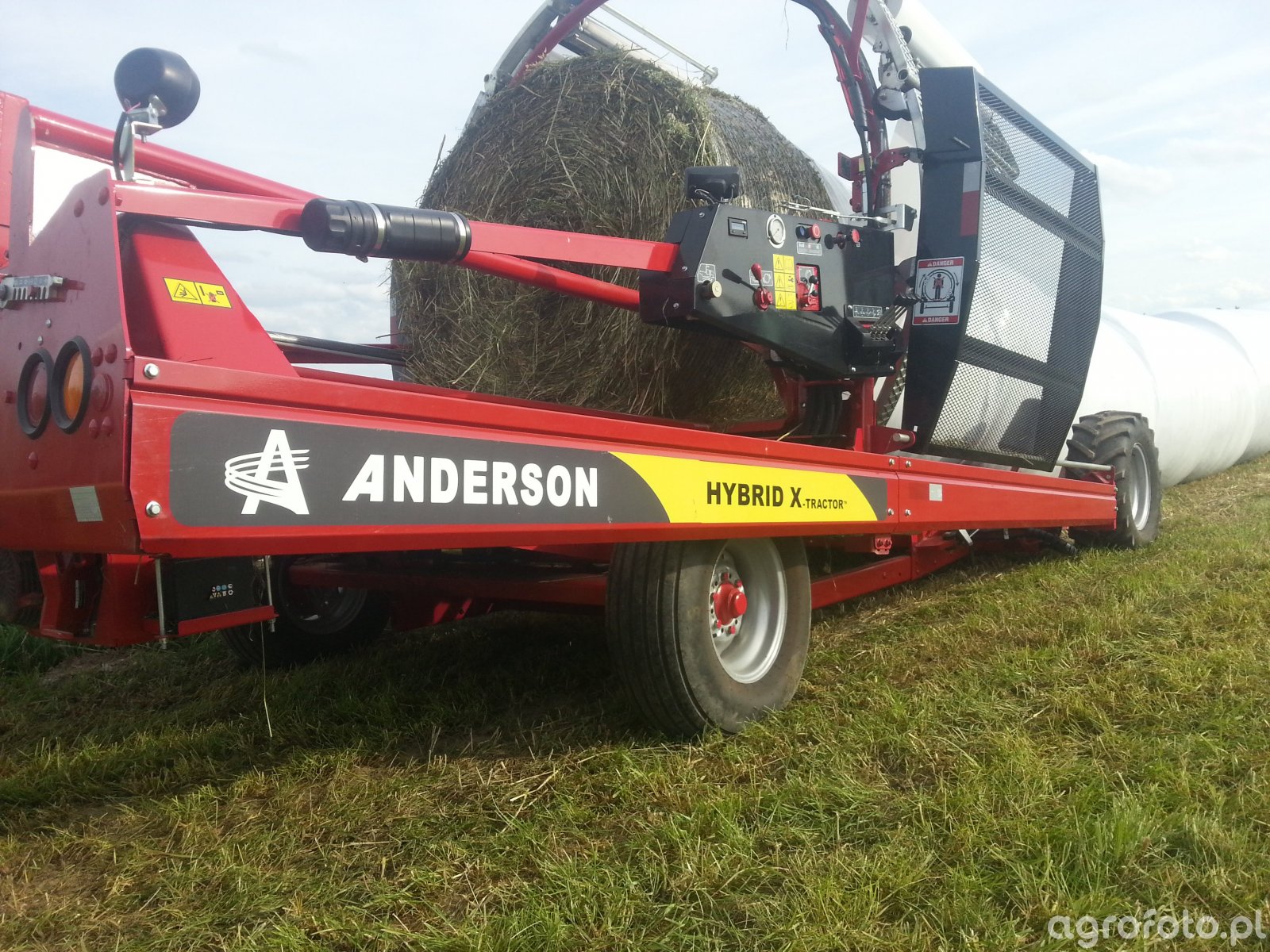 Owijarka szeregowa firmy Anderson model Hybrid X. Wydajność 180 bel na godzinę, osczędność folii ponad 50 %. Waga 2700. Można na niej owiajć bele do 180 cm średnicy jak i bele prostopadłościene do 180 cm długości.