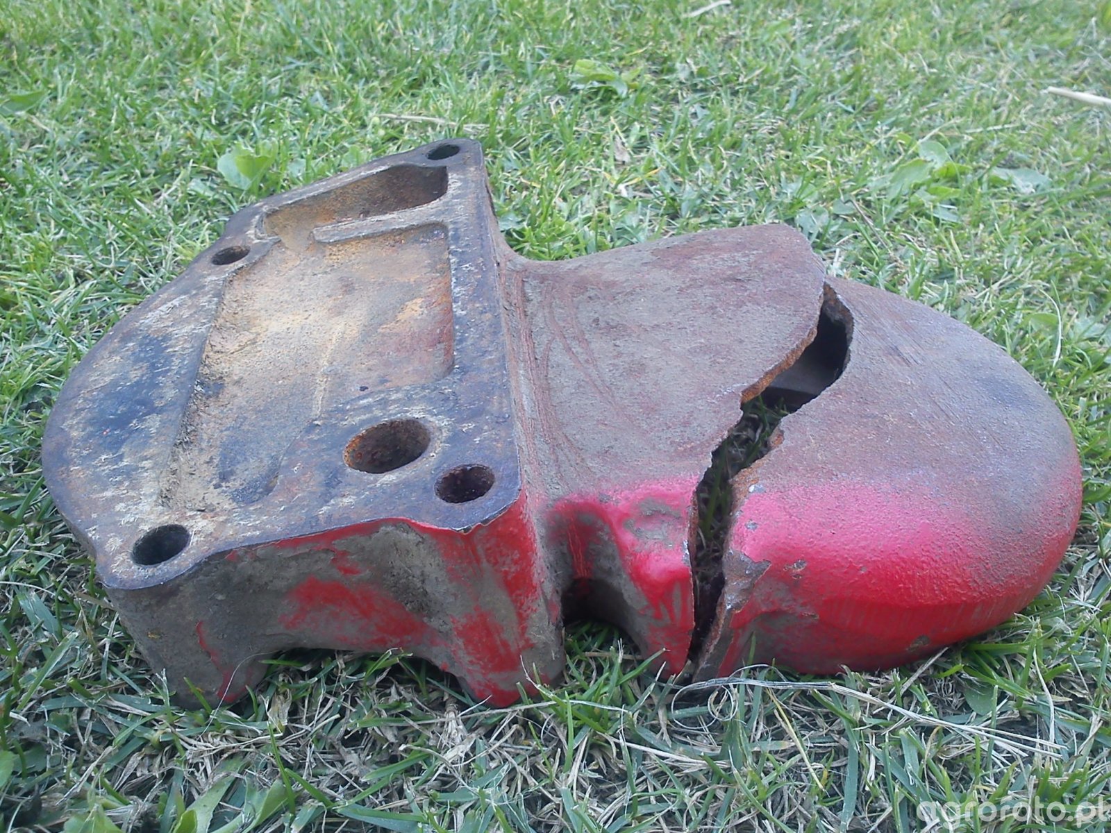 Przedstawiony element to część układu chłodzenia z kombajnu Massey Ferguson MF 440. Charakterystyczny czerwony kolor oraz kształt nawiązują do marki Massey Ferguson, znanej z wytrzymałych maszyn rolniczych. Część ta, prawdopodobnie pokrywa lub element korpusu układu chłodzenia, jest widocznie uszkodzona, co może wpływać na efektywność chłodzenia silnika podczas prac polowych. Kombajny serii MF 440 zazwyczaj wyposażone są w mocne silniki o mocy około 110 KM, co pozwala na efektywną pracę w trudnych warunkach. Element znajdujący się na zdjęciu leży na trawiastej powierzchni, co sugeruje, że został zdemontowany w celu naprawy lub wymiany, prawdopodobnie na terenie gospodarstwa rolnego. Choć zdjęcie nie przedstawia samej maszyny, uszkodzenie takiego elementu mogłoby prowadzić do przegrzewania silnika, co wymaga natychmiastowej naprawy dla zachowania sprawności kombajnu.