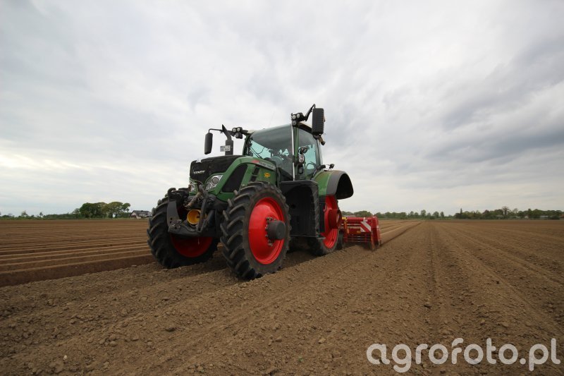 Ciągnik Fendt 724 Vario pracuje na zaoranym polu, doskonale współpracując z ciężkim sprzętem rolniczym. Zasilany przez 6-cylindrowy silnik o pojemności 6,1 litra produkcji Deutz, oferuje moc znamionową wynoszącą 237 KM, co umożliwia efektywne zarządzanie trudnym terenem. Bezstopniowa skrzynia biegów Vario zapewnia płynną i precyzyjną kontrolę prędkości podczas orki, zwiększając wydajność oraz jakość pracy. W tle współpracuje z siewnikiem, co dodatkowo podkreśla wszechstronność tego modelu w codziennych zadaniach rolniczych. Halogenowe reflektory pozwalają na wydłużenie pracy również w trudnych warunkach oświetleniowych, czyniąc Fendt 724 Vario kluczowym narzędziem na każdym nowoczesnym gospodarstwie.