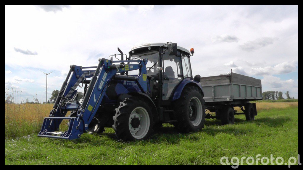 Ciągnik Farmtrac 675DT pracuje na łące, wykorzystując swoją moc 75 KM, aby efektywnie współdziałać z przyczepą rolniczą o ładowności 4 ton podczas transportu zielonki. Wyposażony w 4-cylindrowy silnik, pozwala na precyzyjne manewrowanie i zapewnia niezbędną wydajność w pracy polowej. Jego mechaniczna skrzynia biegów 8/2 umożliwia płynne dostosowywanie się do warunków terenowych, co jest kluczowe podczas załadunku i rozładunku materiału. Współpraca z przyczepą o funkcji wywrotki doskonale ilustruje wszechstronność tego modelu w działaniach związanych ze zbiorami i transportem surowców na gospodarstwie.