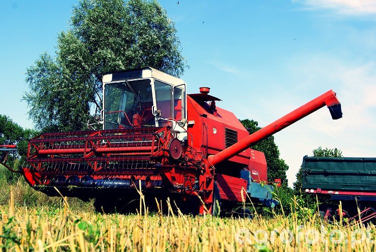Kombajn Bizon Z058 podczas prac żniwnych na ściernisku. Maszyna przeznaczona do koszenia zbóż wyposażona jest w silnik wysokoprężny SW 400 o mocy 100 KM, co zapewnia odpowiednią moc do wymagających działań żniwnych. Kombajn ten dysponuje bębnowym systemem omłotu o szerokości 1200 mm, co umożliwia efektywne oddzielanie ziarna. Zbiornik ziarna o pojemności 3000 litrów pozwala na dłuższą pracę bez potrzeby częstego opróżniania. Widoczny heder z motowidłami sugeruje, że maszyna jest w trakcie koszenia zboża, działając w typowym kontekście polowym. Czerwona kolorystyka kombajnu jest charakterystyczna dla marki Bizon, podkreślając jej polskie dziedzictwo w inżynierii rolniczej.