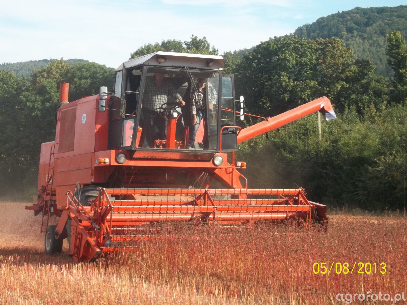 Kombajn Bizon Z056 podczas prac żniwnych na polu gryki. Charakteryzuje się charakterystyczną czerwoną barwą i wyposażony jest w heder z motowidłami, co wskazuje na zbiór zbóż. Model Bizon Z056, popularny w Polsce, jest napędzany rzędowym silnikiem typu SW400 o pojemności 6,54 l, generującym moc około 100 KM. Kombajn wykorzystuje bębnowy system omłotu, który skutecznie oddziela ziarno od słomy, zachowując wysoką jakość plonu. Zbiornik na ziarno o pojemności 3000 litrów umożliwia długotrwałą pracę bez konieczności częstego opróżniania, a jego solidna konstrukcja zapewnia niezawodność w różnorodnych warunkach polowych. W tle widoczne są zalesione wzgórza, co podkreśla malownicze otoczenie pracy maszyny.