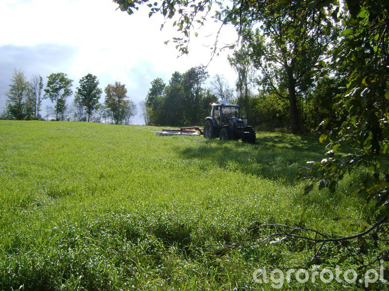 Ciągnik Farmtrac 7100DT pracuje na łące, współpracując z kosiarką dyskową Lely Splendimo 280M. Wyposażony w silnik o mocy 100 KM, ciągnik ten jest zdolny do efektywnego koszenia dużych powierzchni trawiastych. Silnik Farmtrac 7100DT to model Perkinsa, zapewniający niezawodność dzięki 4-cylindrowej jednostce o pojemności skokowej 4,4 litra. Moc ciągnika umożliwia skuteczną współpracę z kosiarką, co jest niezbędne podczas intensywnych prac polowych. Mechaniczna skrzynia biegów z optymalnym przełożeniem pozwala na płynne prowadzenie zestawu, co jest kluczowe podczas koszenia na nierównym terenie.