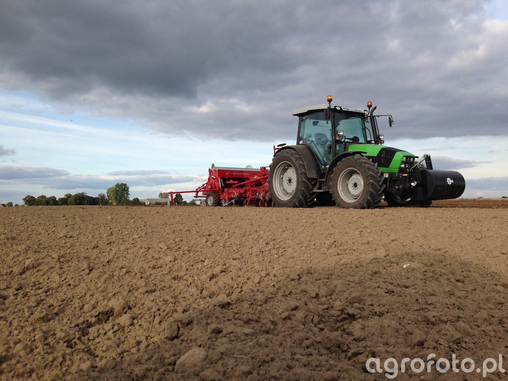 Ciągnik Deutz-Fahr TTV współpracuje z siewnikiem Kongskilde podczas precyzyjnego siewu na polu. Wyposażony w mocny, 6-cylindrowy silnik Deutz o pojemności 6.1 litra, który generuje 210 KM, zapewnia wydajność i niezawodność w trudnych warunkach polowych. Bezstopniowa skrzynia biegów CVT umożliwia płynne dopasowanie prędkości do zmiennych warunków glebowych, co jest kluczowe podczas pracy z dużymi maszynami towarzyszącymi, takimi jak siewniki. Tylni trzypunktowy układ zawieszenia o maksymalnym udźwigu ponad 10000 kg pozwala na bezproblemową obsługę ciężkich narzędzi. Dzięki tym rozwiązaniom technologicznym ciągnik Deutz-Fahr TTV z łatwością radzi sobie z wymagającymi zadaniami rolniczymi, zwiększając efektywność i precyzję siewu.