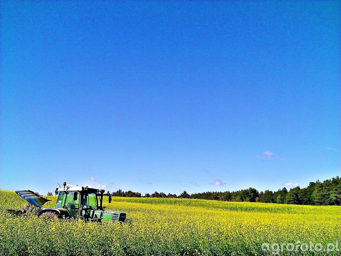 Ciągnik Fendt 514 pracuje na polu, współpracując z pługiem Kverneland LD 100. Model 514 charakteryzuje się mocą znamionową wynoszącą 150 KM, dostarczaną przez silnik Deutz z czterema cylindrami o pojemności 4.04 litra. Ciągnik wyposażony jest w skrzynię biegów typu Vario, co umożliwia płynne dostosowywanie prędkości do warunków polowych i zapewnia efektywną pracę podczas orki. Pług Kverneland LD 100 wspiera Fendt 514 w precyzyjnym przygotowaniu gleby, wykorzystując optymalne ustawienia przy różnych głębokościach, co w połączeniu z zaawansowaną mechaniką ciągnika, pozwala na skuteczne zagospodarowanie dużych powierzchni uprawnych.