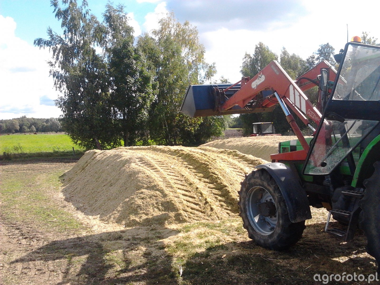 Ciągnik Deutz Fahr DX 6.05 zajmuje się ugniataniem kiszonki z kukurydzy na pryzmie. Wyposażony w 6-cylindrowy silnik o pojemności 6 litrów, zapewnia moc znamionową około 110 KM, co pozwala na sprawne wykonywanie ciężkich prac polowych. Dzięki mechanicznej skrzyni biegów 16/8 operator ma pełną kontrolę nad pracą w zmiennych warunkach terenowych. Moc silnika umożliwia efektywną współpracę z ładowaczem czołowym, który ułatwia załadunek i rozładunek materiału. Cały zestaw działa harmonijnie, co przyczynia się do równomiernego rozłożenia kiszonki oraz jej optymalnego zagęszczenia, zapewniając wysoką jakość paszy dla zwierząt.