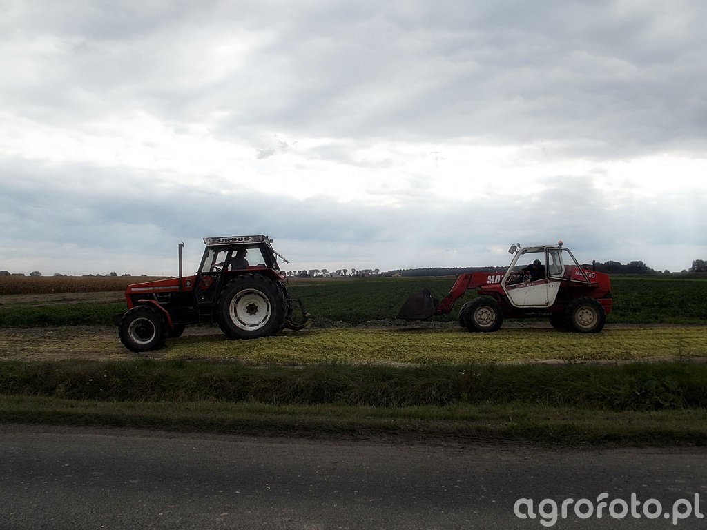 Ursus 1224 w trakcie pracy przy pryzmie kiszonki współpracuje z ładowarką teleskopową Manitou 626, która podaje materiał do rozgarniania i ugniatania. Ten ciężki ciągnik z serii ciężkiej Ursusa, produkowany w latach 1984–1993, wyposażony jest w 6‑cylindrowy silnik wysokoprężny Zetor Z 8001 o pojemności 7,97 l i mocy około 117 KM, co zapewnia wystarczający zapas momentu przy jeździe po stromych, śliskich skarpach pryzmy. Mechaniczna skrzynia biegów 16/8 z reduktorem pozwala dobrać przełożenie do powolnego, równomiernego ugniatania kiszonki, a tylni TUZ o udźwigu około 4,2 t umożliwia montaż ciężkich wałów lub innych narzędzi do dogęszczania masy. Masa własna ciągnika rzędu 5,2 t poprawia efektywność ugniatania, co w połączeniu z precyzyjnym podawaniem materiału przez Manitou 626 przekłada się na dobrą jakość zakiszania. Przybliżone ceny używanego Ursusa 1224 na rynku polskim mieszczą się zazwyczaj w przedziale 55–85 tys. zł w zależności od stanu i wyposażenia.