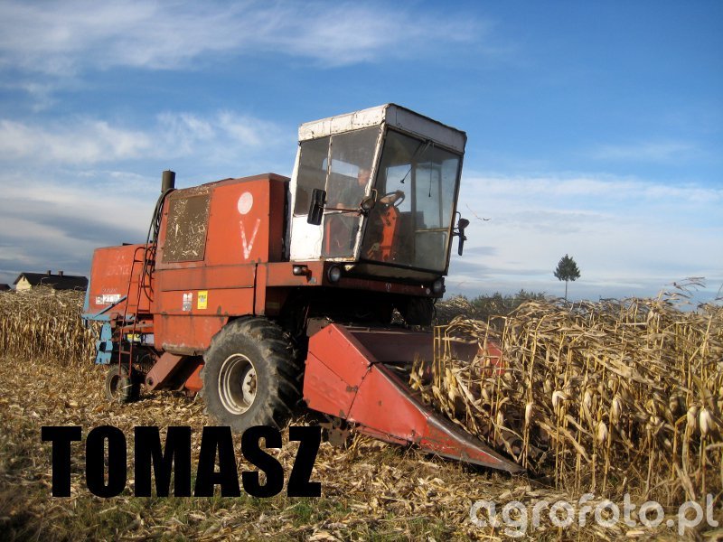 Kombajn Bizon Super Z056 podczas zbioru kukurydzy. Maszyna charakteryzuje się czerwoną kolorystyką i prostokątną kabiną operatora, co jest typowe dla tego modelu. Wyposażony w heder z dziobami, kombajn efektywnie zbiera kolby kukurydzy z pola. Bizon Super Z056 jest napędzany silnikiem wysokoprężnym SW 400 o mocy około 105 KM, co pozwala mu na sprawne działanie na dużych obszarach uprawnych. Zbiornik ziarna ma pojemność 3,5 tony, co umożliwia dłuższą pracę bez częstych przerw na rozładunek. W trakcie pracy na polu kukurydzy kombajn sprawnie manewruje między rzędami upraw, a jego konstrukcja pozwala na efektywne przetwarzanie plonów.