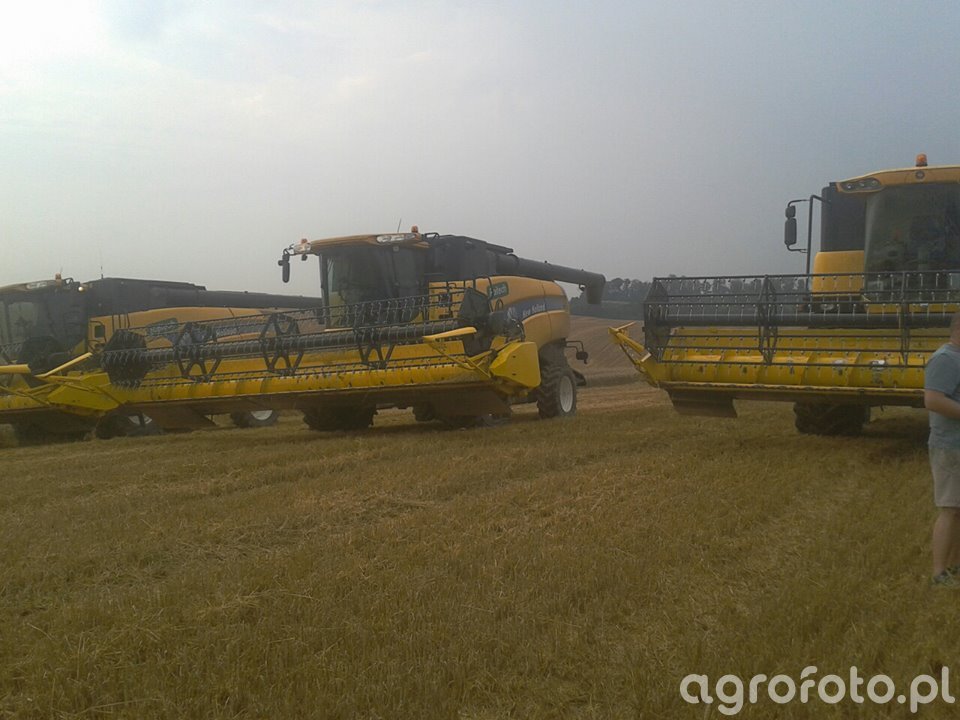 Kombajn New Holland serii CX, prawdopodobnie model CX8090, podczas prac żniwnych na polu. Maszyna jest wyposażona w szeroki heder z motowidłami, co wskazuje na koszenie zbóż. Kombajn napędzany jest silnikiem o mocy około 450 KM, który efektywnie zasila konwencjonalny system omłotu z bębnem młócącym. Pojemność zbiornika na ziarno wynosi około 11,5 tys. litrów, co pozwala na długotrwałe działanie bez częstych przerw na rozładunek. Charakterystyczne żółto-niebieskie barwy obudowy oraz zaawansowany układ kabiny zapewniają zwiększony komfort i wydajność operatora podczas pracy na rozległych polach.