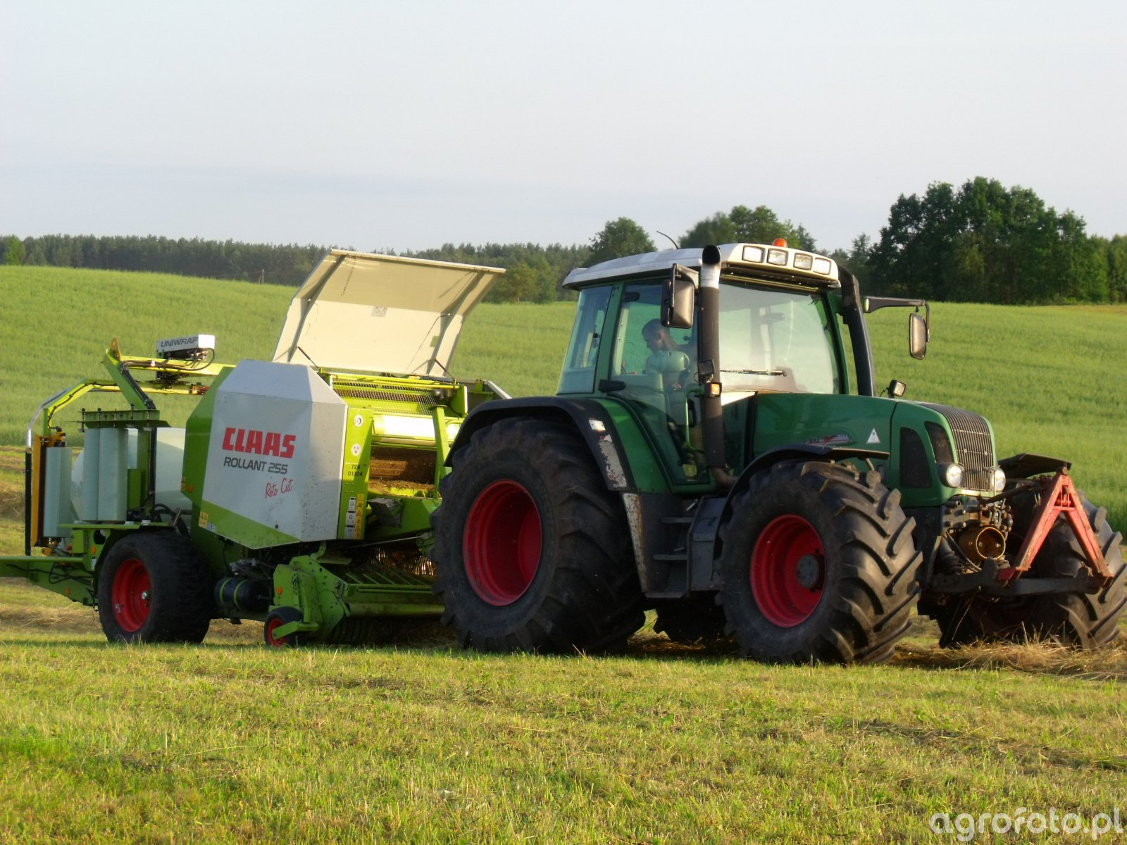 Ciągnik Fendt 716 Vario, wyposażony w silnik o mocy 165 KM, pracuje na polu, współpracując z prasą zwijającą Claas Rollant 255. Ten model, napędzany 6-cylindrowym silnikiem Deutz, o pojemności 6,06 litra, zapewnia efektywność i wydajność podczas prasowania sianokiszonki. Bezstopniowa skrzynia biegów Vario umożliwia płynną regulację prędkości, dostosowując ciągnik do różnych warunków terenowych i zwiększając precyzję oraz komfort pracy. Dzięki odpowiedniej integracji z prasą, Fendt 716 Vario doskonale radzi sobie z ciężkimi zadaniami, co czyni go niezastąpionym elementem w pełni zmechanizowanego systemu rolniczego.