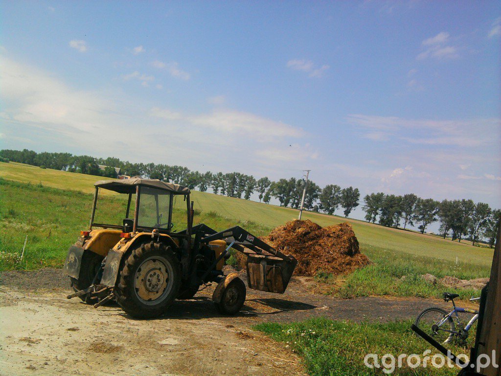 Ursus C-330 z ładowaczem czołowym TUR wykonuje załadunek obornika do rozrzutnika na placu gospodarstwa, wykorzystując swoją zwartą konstrukcję i dobrą zwrotność typową dla lekkich ciągników pomocniczych. Model C-330 był produkowany w latach 1967–1987 i wyposażony jest w dwucylindrowy silnik wysokoprężny S-312C o pojemności 1960 cm³ i mocy około 30 KM, co w połączeniu z prostą, mechaniczną skrzynią biegów 6/2 pozwala na precyzyjne manewrowanie przy pracy z ładowaczem. Masa własna ciągnika wynosi około 1900 kg, a tylny TUZ oferuje udźwig rzędu 1200 kg, dzięki czemu C-330 sprawdza się zarówno przy obsłudze rozrzutnika, jak i innych maszyn zaczepianych. Na polskim rynku wtórnym przybliżone ceny zadbanych egzemplarzy z turem mieszczą się zazwyczaj w przedziale 20–35 tys. zł, zależnie od stanu technicznego i wyposażenia.